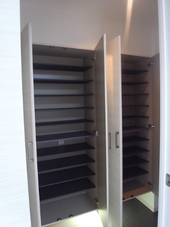 トールタイプのシューズボックスが扉3枚分。収納力は抜群!可動式の棚を調節すればブーツなどでもそのまま収納可能です。