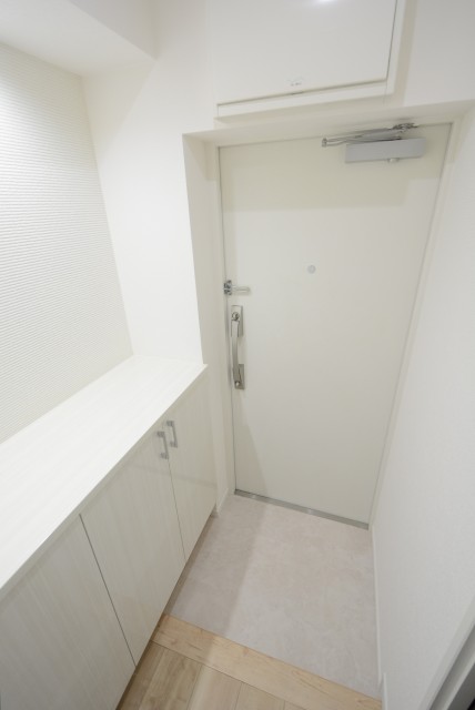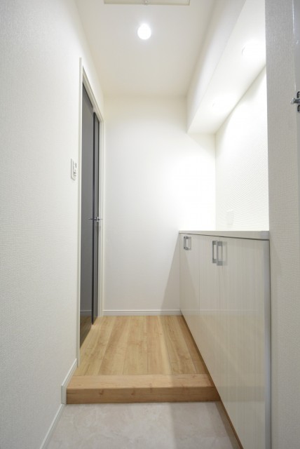 真っ白で、どんな物を置いても合いそうですね。シューズボックスの上は結構広いので、鍵や小銭などを置くような実用的な使い方以外にも、お花や写真、置物などを置いたりしたいところです。余裕のあるスペースっていいですよね♬