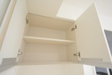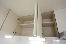 収納は調理台下のスライドキャビネットと吊戸棚。スライドキャビネットは引き出し式で出し入れがしやすいのが特徴です。ギッチリ詰めても収納物の確認がしやすいのも嬉しいですね。吊戸棚は真逆のタイプなのであまり使わない物を入れておくのが良さそうです。