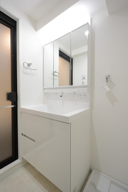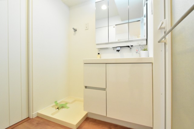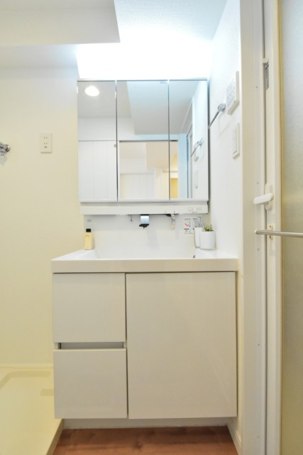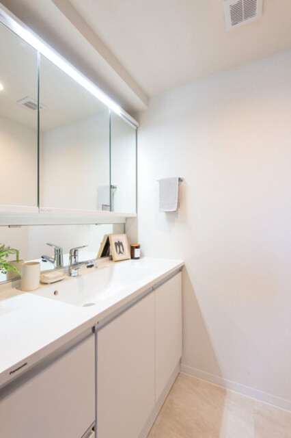白を基調にした清潔感のある洗面化粧台は三面鏡付。裏はキャビネットになっているので洗面周りの細々としたものもすっきり片付けられます。二人くらいなら並んで使えそうな幅も忙しい朝には嬉しいですよね。