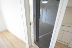 中間調のフローリングに白のクロスのオーソドックスなテイストに、ダークブラウンの鏡面仕上げのドアがアクセントになってシャープで男性的な雰囲気をプラスしています。奥の洋室の窓からの光がリビングにまで届いていて明るいですね。