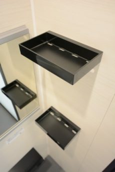 収納は三面鏡裏のキャビネットと洗面台下。細々した物が多くなりがちな洗面廻りには豊富な収納が有り難いですね。様々なタイプがあって、大きな物から細かい物までバランスよく収まりそうです。