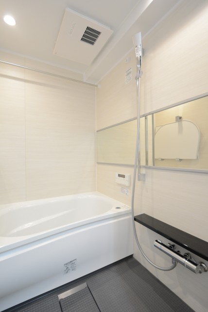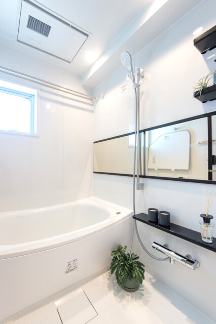 モノトーンでまとめられた浴室はマンションでは珍しい窓付きで特別感いっぱい!!お休みの日に朝からのんびり湯舟に浸かるなんて、ちょっと温泉みたいでイイですよね。浴室換気乾燥機が付いていますので、換気は窓だけに頼らずに併せて使っていきましょう。その他に浴室暖房や洗濯物の乾燥などにも使えますよ。