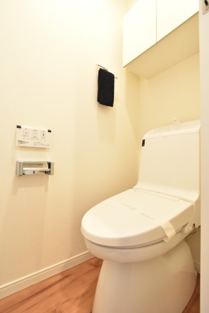 最初のドアはトイレになっています。TOTO製の洗浄機能一体型。トイレットペーパーのストックや掃除道具を入れるのに便利な吊戸棚も付いています。