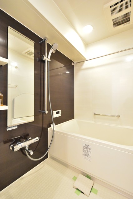 浴室は、ダークブラウンのアクセントパネルで落ち着いた雰囲気。