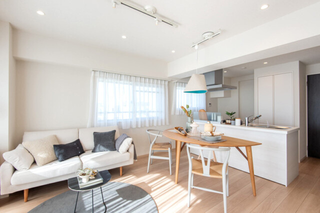 角部屋ならではの二面採光!たくさんの窓から射し込む明るい光が、ナチュラルな内装にピッタリですね。アイランドタイプのキッチンを中心据えた、居心地の良さそうなお部屋です。キッチンには食器洗浄乾燥機をはじめ、家事を助けてくれる機能も充実していますよ。