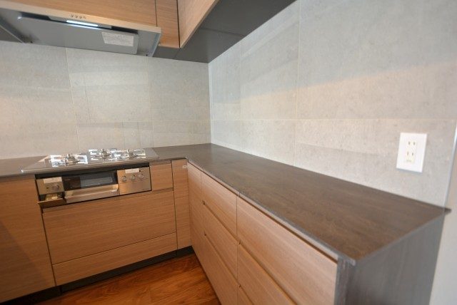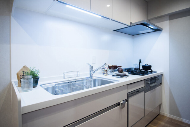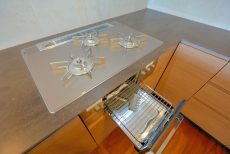 収納は出し入れのしやすいスライドキャビネット。ぎっしり詰めても中身のチェックがしやすいのも嬉しいですよね。食器洗浄乾燥機が付いているので、洗い物はお任せして食後はのんびり過ごしましょう! コンロは3口、グリル付き。