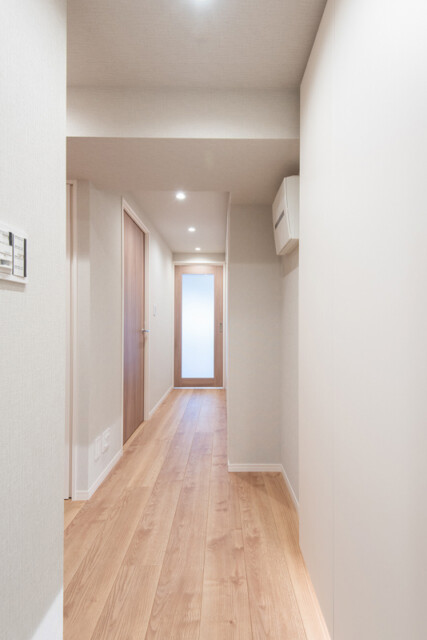 玄関から続く廊下はナチュラルな木目と白を使った落ち着いた印象。途中で折れ曲がっているため戸口から室内の様子が見えづらくなっています。昨今は宅配便やフードデリバリーなどを使う機会が増えているので、このような造りは有難いですよね。