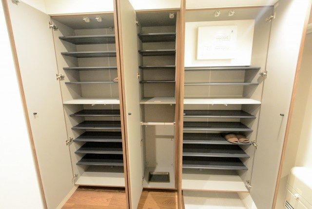 二つ並んだ扉はシューズボックスと収納棚。入れるものによって棚の高さが変えられるので、効率的に収納ができそうです。