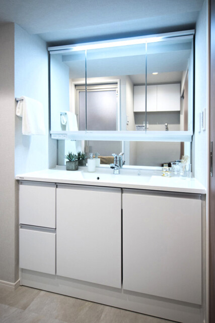 洗面化粧台は身だしなみを整えるのに便利な三面鏡付き。鏡裏がキャビネットになっているので、洗面周りに散らかりがちな細々したものもスッキリと片付けることができますよ。