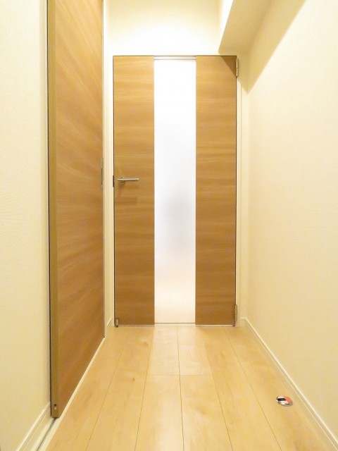 玄関をあがると目の前は廊下。建具もフローリングも木目調であたたかみのある雰囲気です。左側の扉は洗面室、正面の扉はLDK。
