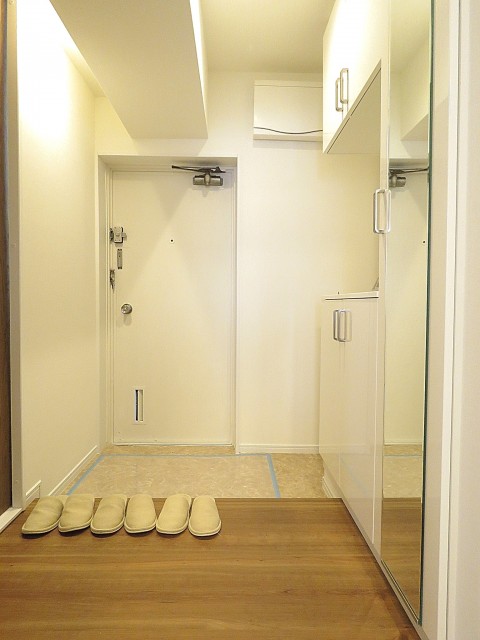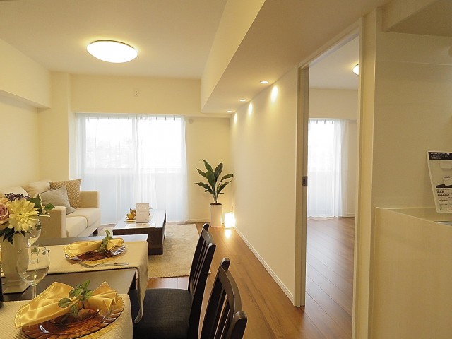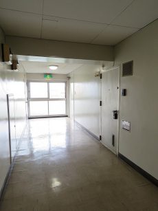 共用廊下はツルリとしたタイル貼りの内廊下。玄関前で雨や風の影響をうける心配もありません。各玄関扉もほどよく距離が離れています。