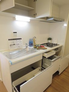 壁付けのキッチンは吊り棚に引き出しと収納スペースが豊富!