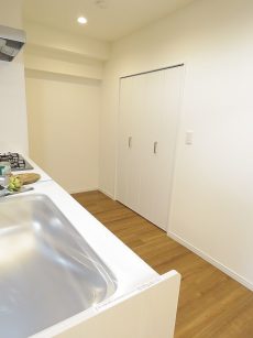 キッチンはフローリングに馴染む木目柄。対面式なのでリビングにいる家族と会話を楽しみながらお料理ができます。 水栓は浄水機能付き、コンロは3口ガスコンロとスペックも◎。洗濯機置場がキッチン横に設けられているのでお料理しながらお洗濯と家事もまとめてこなしやすそうです。
