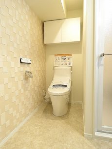トイレはウォシュレット付き。ペーパーのストックや掃除用具は上に設置された吊戸棚に仕舞えるので足元もスッキリ。