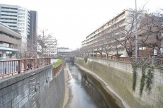 マンションのエントランスは桜の名所「目黒川」沿いから向かいます。