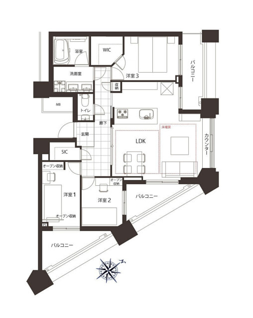 お部屋は31階!専有面積79.09㎡の3LDK。全居室がバルコニーに面した、ファミリータイプのお部屋です。31階からの眺め楽しみですね♪