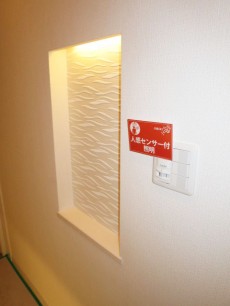 玄関左手にはニッチが設けられています。間接照明&ウネウネ模様のアクセント クロス(もっと格調高い表現が見つかればいいんですがorz)が素敵です。 BALS TOKYOで横長タイプのフラワーベースを買ってくるとぴったりはまりそう。