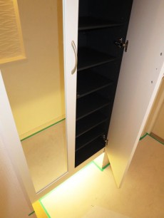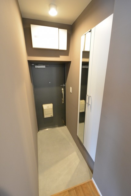 こちらが玄関です。玄関の高さと同じスリムなミラーがついています。