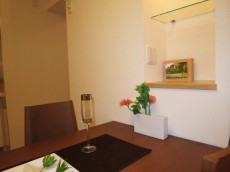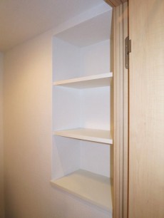 テーブルが配置されている横手にも飾り棚が造作されています。すっきりシンプル に小物を置いてもいいですし、調味料なんぞ並べておいても良さそうです。 さらに横にはクローゼットがありました。リビングに大きい収納があると、季節 外れの家電や掃除機を入れておくのに大変便利です。