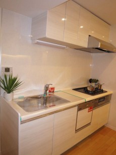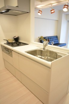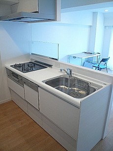 リビングダイニングの一角にシステムキッチン。人造大理石トップのホワイトに、 お野菜のビタミンカラーがよく似合いそう。 シンクの水栓は浄水器一体型、さらにビルトインタイプの食器洗浄機が設置されて いるというハイスペックぶりです。
