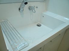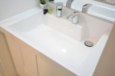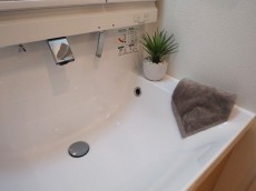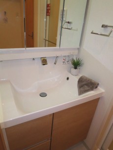 継ぎ目のない洗面ボウルが美しい洗面化粧台。お手入れも簡単ですね。水栓には 節水効果のあるエコハンドルが採用されていました。 三面鏡の裏側は収納になっていますので、洗面台まわりに散らばりがちな小物を すっきりお片づけしておけます。ドライヤー、シェーバーもすっぽり入るように 設計されていますよ。