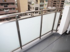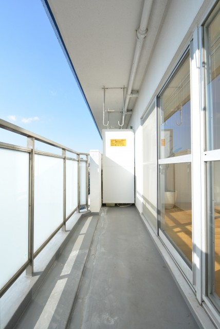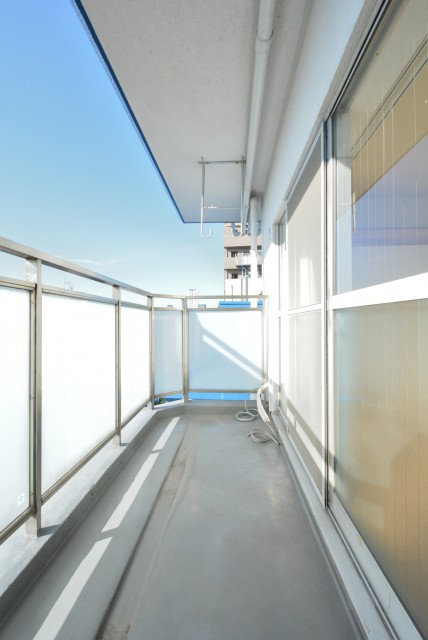 広さ5.94㎡、南西向き。幅はそれほどですが奥行があって広々と感じるバルコニーです。すりガラスの手すりを使用し、プライバシーに配慮しながら光が入るようにしています。