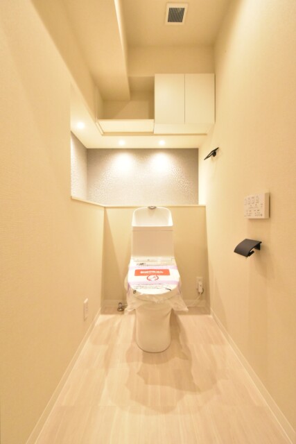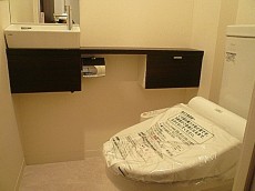 ウォシュレット付トイレです。小さな洗面台とブラウンの高級感漂うカウンターがあります。