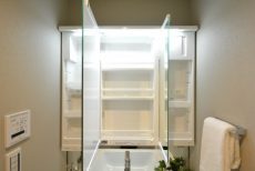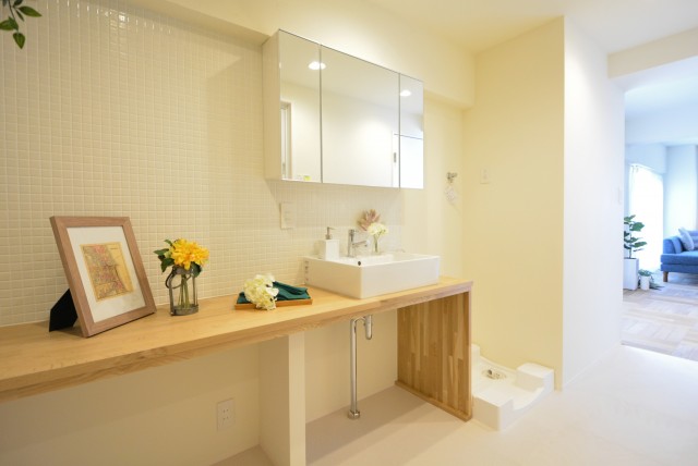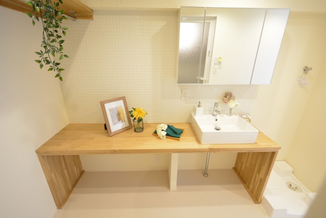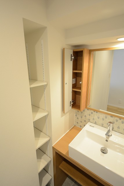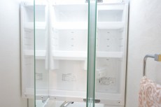 洗面化粧台は3面鏡の裏が収納になっています。コスメや水廻りのゴチャゴチャ散らかりがちなアイテムもスッキリお仕舞いただけます。