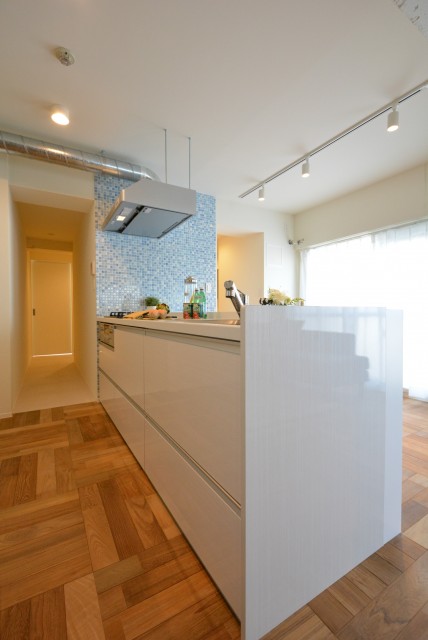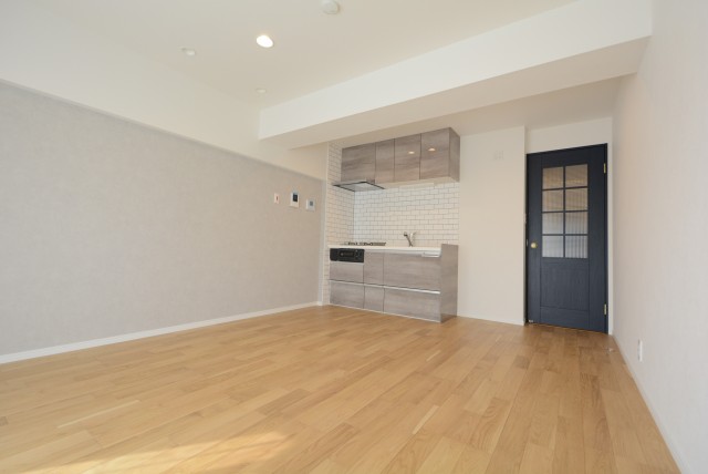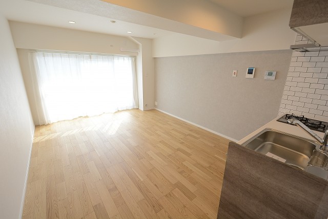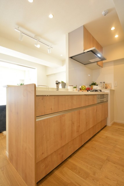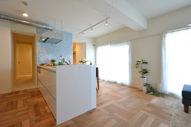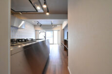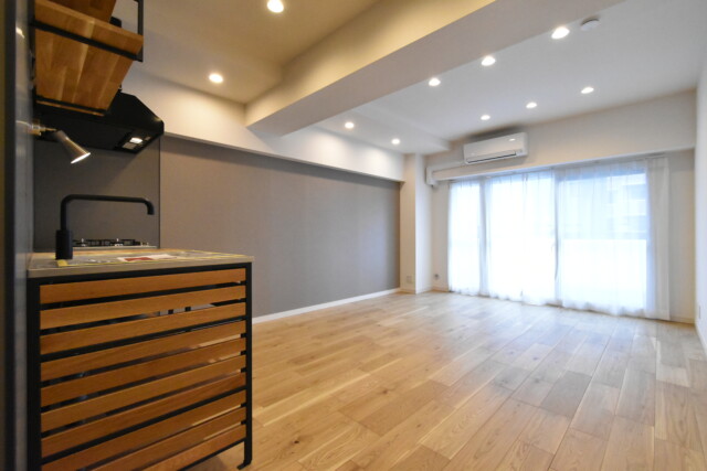 南西向きバルコニーに面した窓から明るい光が射すお部屋です。縦長で、手前に横向きのカウンターキッチン、奥をリビングダイニングで使うレイアウト。横向きのカウンターキッチンは、キッチンのサイズを大きくしやすいというメリットがある反面、キッチン内部が目立ちやすいというデメリットがあります。いかに綺麗に保つかがポイント!