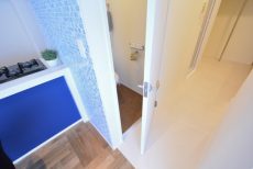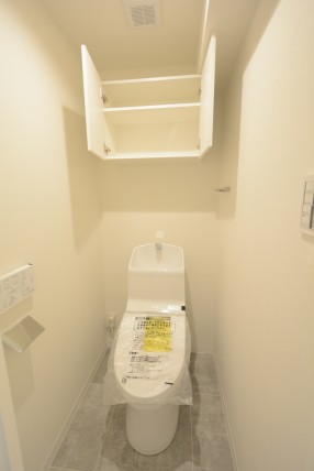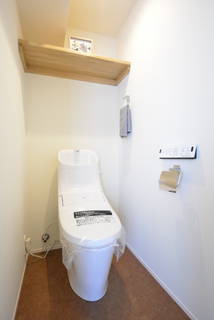 トイレはもちろんウォシュレット付。壁面に棚が造作されていますので、掃除用具 やトイレットペーパーのストックなどはこちらにしまえそうです。無造作に籐や アイアンのバスケットなんて置いて「見せる収納」とかもいいですねえ。