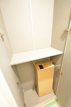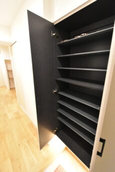 玄関横にはシューズBOXが設置されています。(棚がついていませんが、つけられるようになっています。)一人分の靴ならまとめてこの中に納まりそうです。