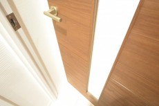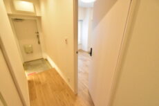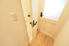 左側に洋室、洗面室、トイレ、右側に電気温水器、収納、洗濯機置場、正面にLDKの扉がついています。順番に見ていきます。