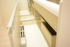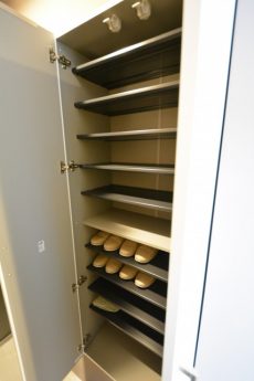 調理台下のスライドキャビネットに加え、後ろ側には揃いのカップボードが設置されています。スライドキャビネットは出し入れや中の確認がしやすくとても使いやすいですよ。