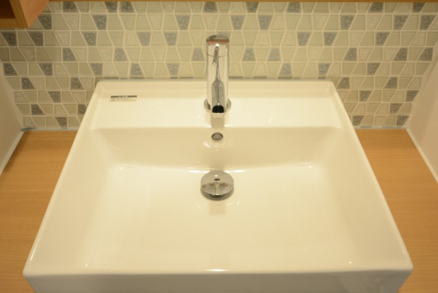 洗面台はミニマルデザイン。無駄なものを排除したシンプルな形状が、壁の凝ったタイルによくマッチしていますね。スタイリッシュでありながらレトロさも感じます。