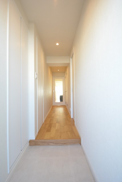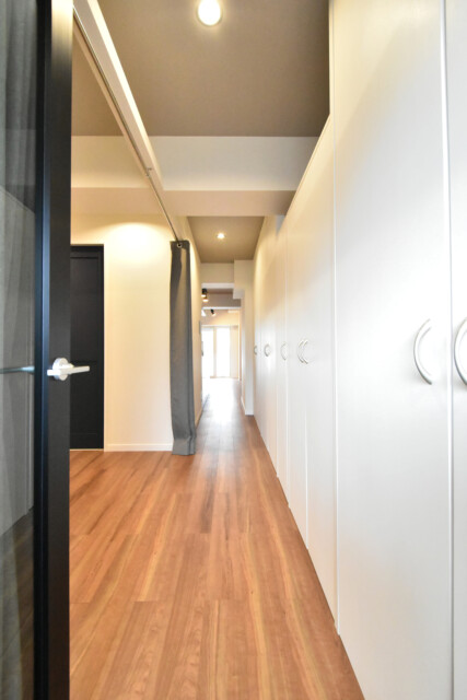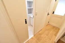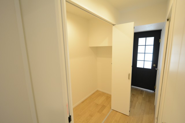 廊下右側にあるウォークインクローゼットです。廊下にあるので扉の開け閉めの際お客様がみえていても大丈夫!帰宅してすぐにコートをかけられたり、場所をとる掃除機やスーツケースなども置けそうです!