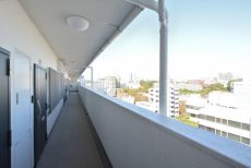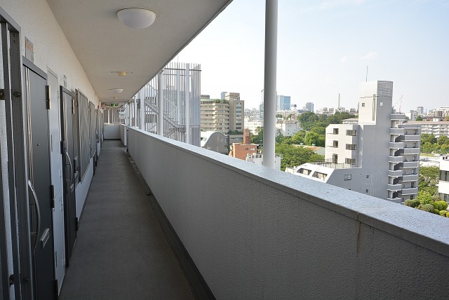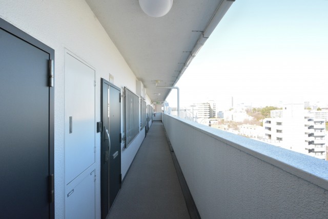エレベーター降りて左の共用部廊下を進みます。見晴らしも開放感バッチリです!