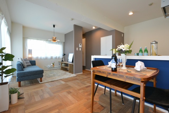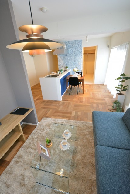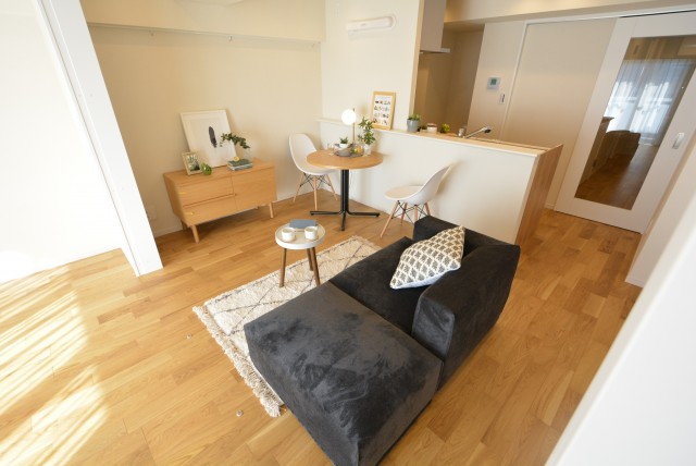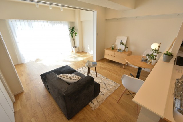リビングダイニングキッチンは約10.0帖。すでに家具が設置されていますので、 新生活のイメージが描きやすいですね。ちなみに家具付での販売となります! ソファにちょっと座ってみましたが、GOOD
