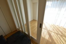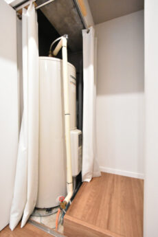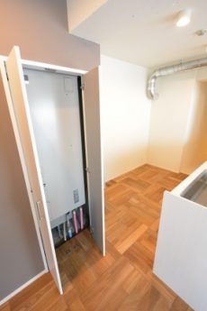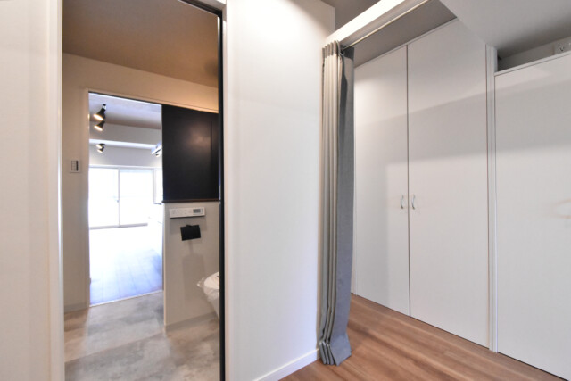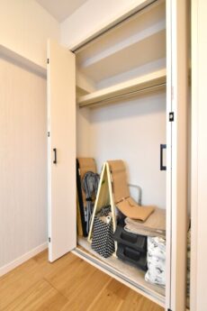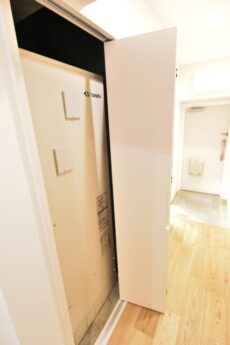 玄関側は幅奥行ともに十分なクローゼット。衣装ケースなどで収納力アップもよさそうです。もう一つは・・・!!!なんと半分は電気温水器に占領されていました!一応カーテンで仕切られ、もう半分はフリーの収納として使えるようです。なんだか更衣室みたいだと思うのは私だけでしょうか(笑)こちらにはスーツケースや季節もの家電、スポーツ用具などの嵩張るものを入れておけそうですね。