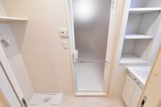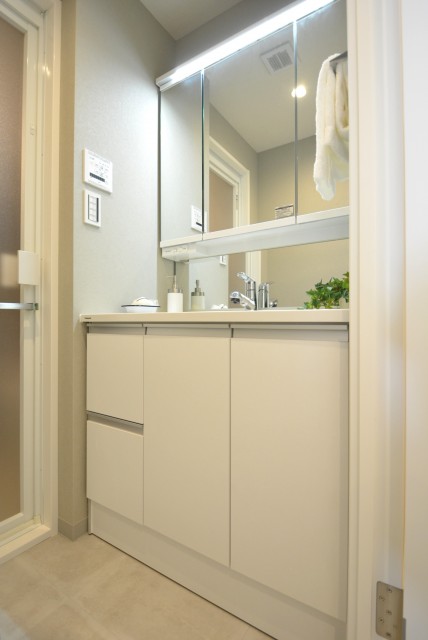 洋室お隣はサニタリールームです。左側には収納豊富な洗面化粧台、正面に浴室です。