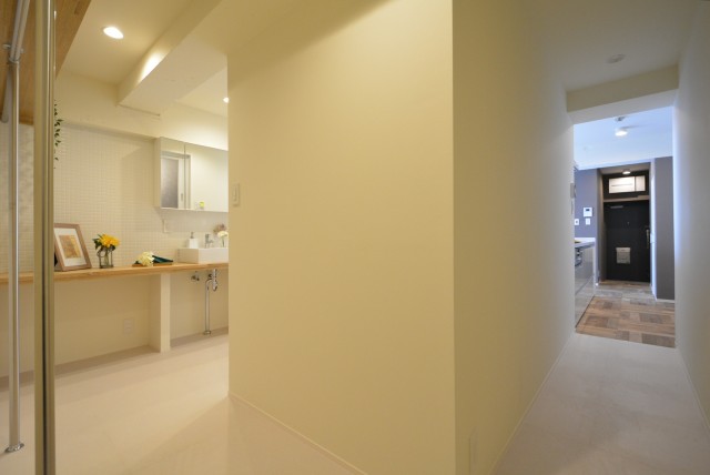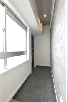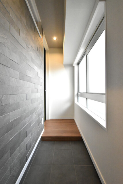 モノトーンのストーン調タイルが床や壁に使われスタイリッシュな印象。今は外廊下に面した窓からの光で明るい空間ですが、夜になればグッと大人の雰囲気になりそうな予感がします(*^^*)