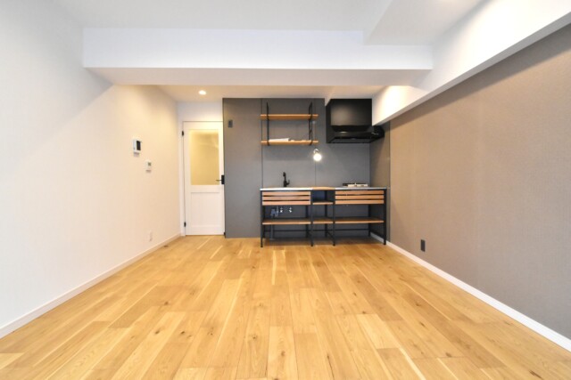 1LDKとなっていますがワンルームのようなレイアウトなので、お部屋越しにここからバルコニーまで見通せて、ちょっと不思議な感じですね。右側にはずらりと収納の扉が並んでいます。