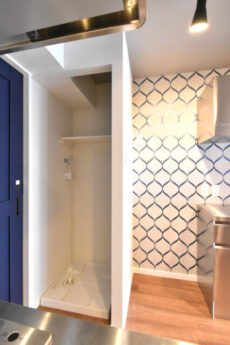 キッチン後ろのカップボードの隣には冷蔵庫スペース。さらにその隣には洗濯機スペースも並んでいました。キッチンに洗濯機は時々見かけますが、扉がないのは珍しいかな。イイ感じなら見せるもよし、ダメならロールカーテンやブラインドで隠すのもありですね。