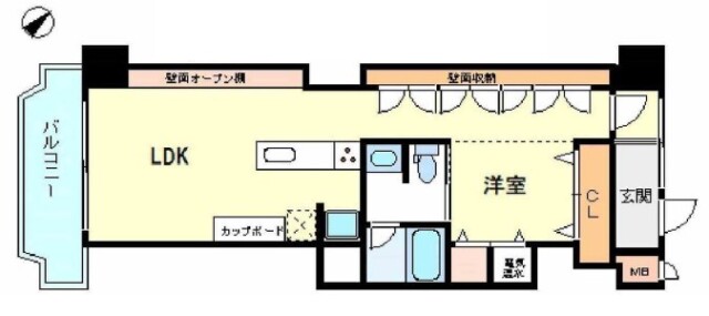 LDK12.0帖です。左にキッチンスペース、奥にはバルコニーに面している明るいリビング・ダイニングです。