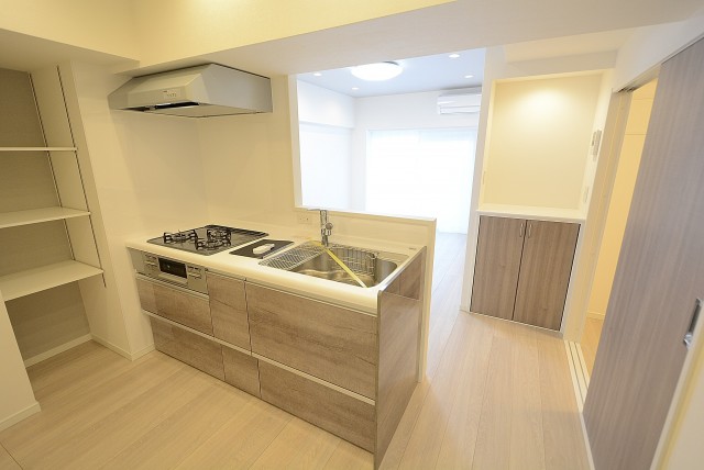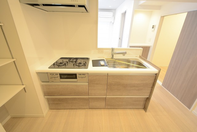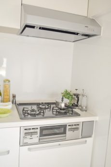 キッチンはホワイトの木目調。お料理がはかどる3口ガスコンロ、浄水機能付き水栓、食洗機、収納スペースたっぷりとスペックは◎!設備が整っているとお料理するのも楽しみになりますね。
