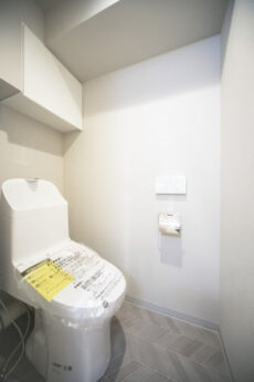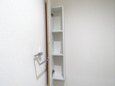 トイレはウォシュレット付き。縦長のスリムな収納も設置されています。