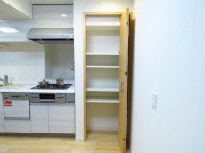 冷蔵庫はキッチンの左側のスペースへ。右側の扉付きの物入れはパントリーとして使ってもよさそうです。