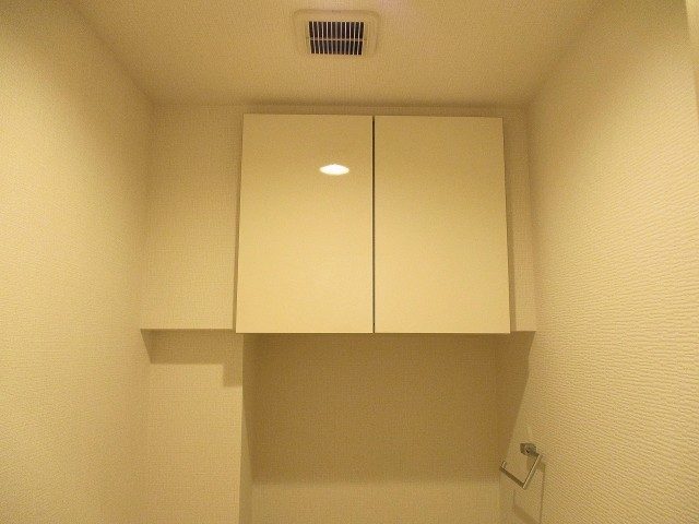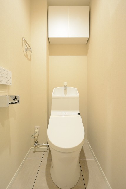 トイレは洗浄機能一体型。トイレットペーパーや掃除道具の収納に便利な吊り戸棚も付いています。