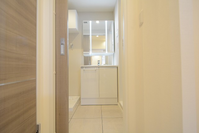 洗面化粧台と洗濯機置場はお隣同士。白で統一されており清潔感があります。キャビネットや棚など収納スペースもしっかり用意されています。