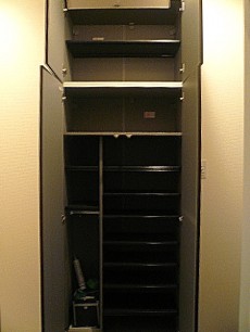 こちらが大容量のトールサイズ玄関収納です。可動棚なので高さのあるシューズも仕舞えそうです。上部にある収納には、シューズの衣替えとして季節によって履かなくなったシューズを仕舞えると良いですね。